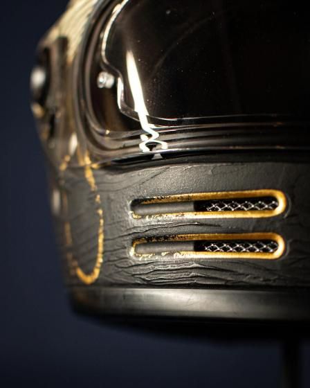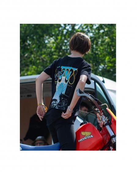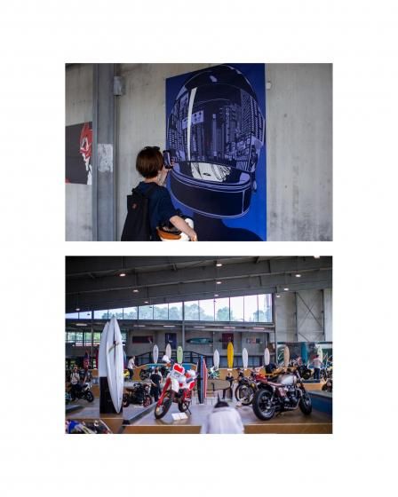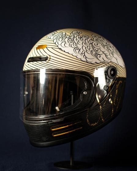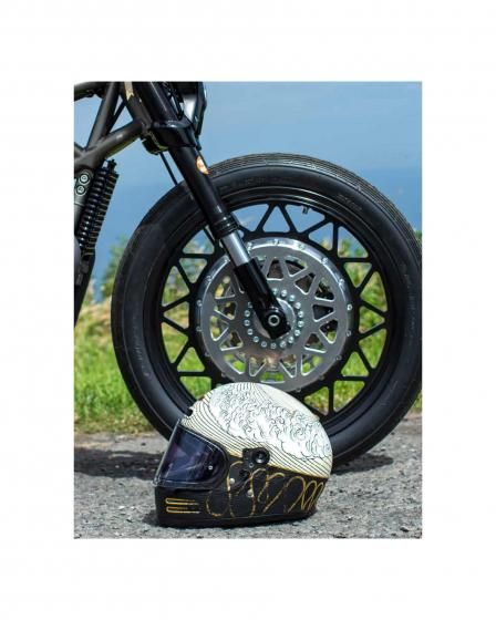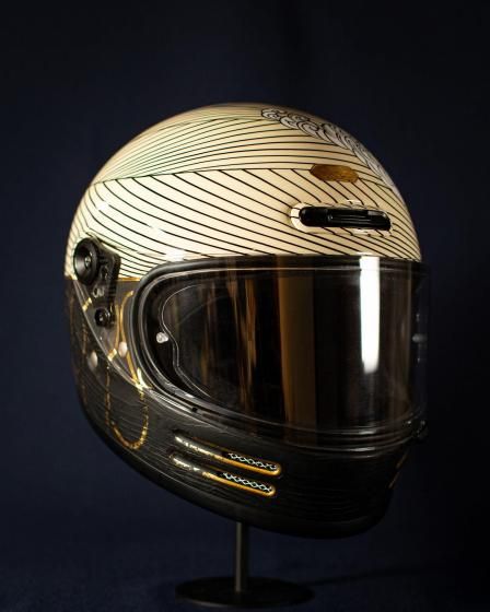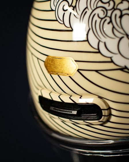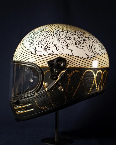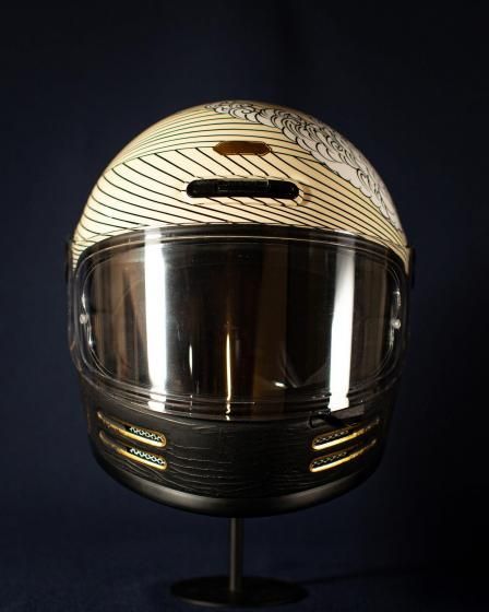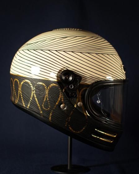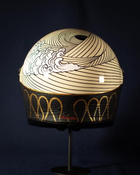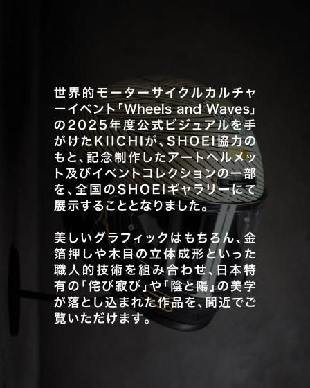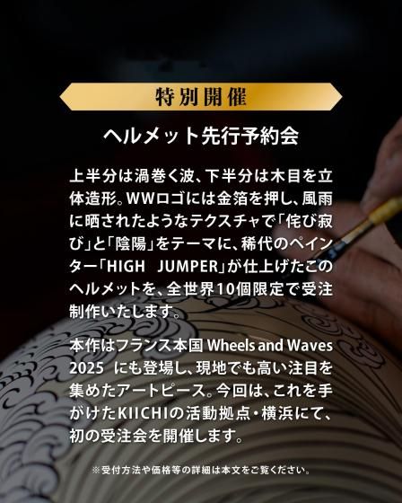 アートワークはモーターサイクルアーティストのKIICHI(キイチ)、ペイントは異端の技巧派ペインター HIGH JUMPER(ハイジャンパー) が担当。グラフィックだけでなく、純金による箔押しや木目の立体成形といった職人的技術を組み合わせ、日本特有の「侘び寂び」や「陰と陽」の美学をヘルメットという立体キャンバスに落とし込みました。このヘルメットは、Wheels and Wavesの本会場であるフランス・ビアリッツにも持ち込まれ、現地のライダーやクリエイター、参加者たちの間でも大きな注目を集めました。